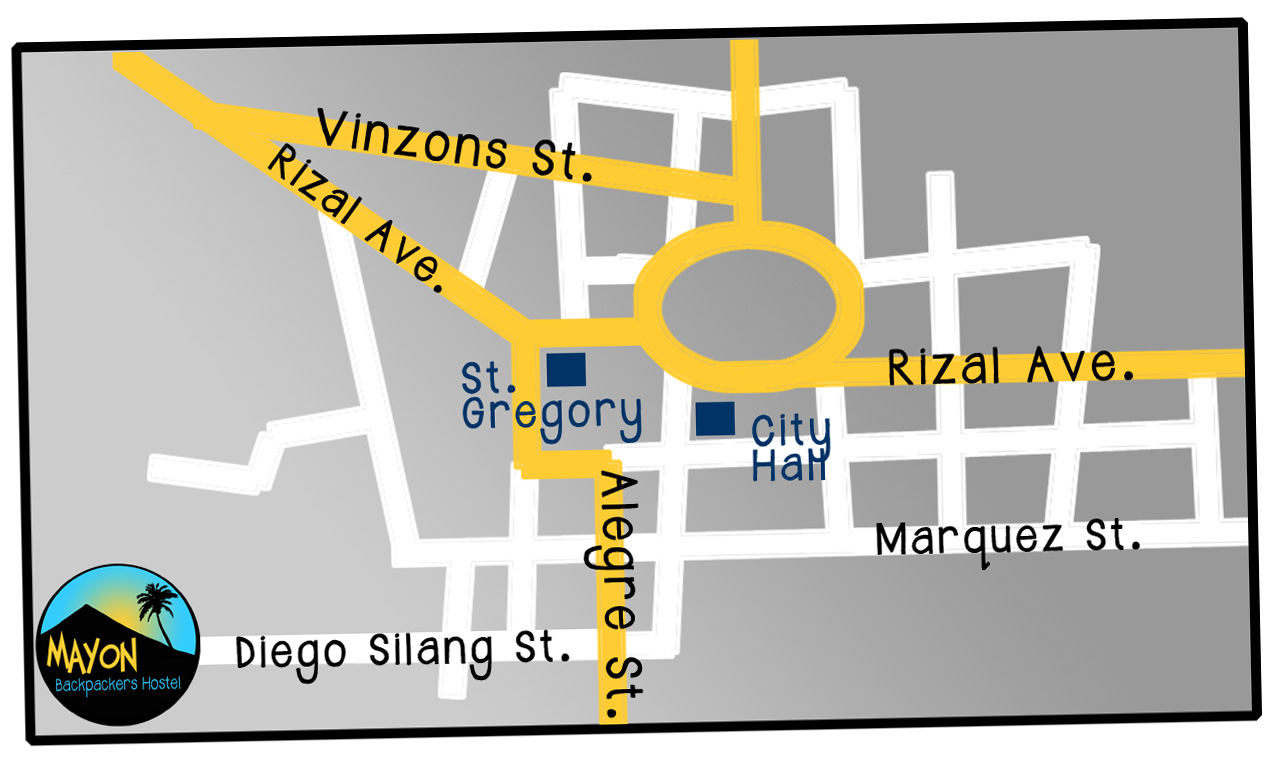 To get here, take a taxi, tricycle or jeepney to Albay Cathedral. From there, you can walk (5 mins) or catch a padyak and ask them to take you to Mayon Backpackers Hostel. We are located in Barangay Maoyod (Brgy. 11) at the end of Diego Silang St.